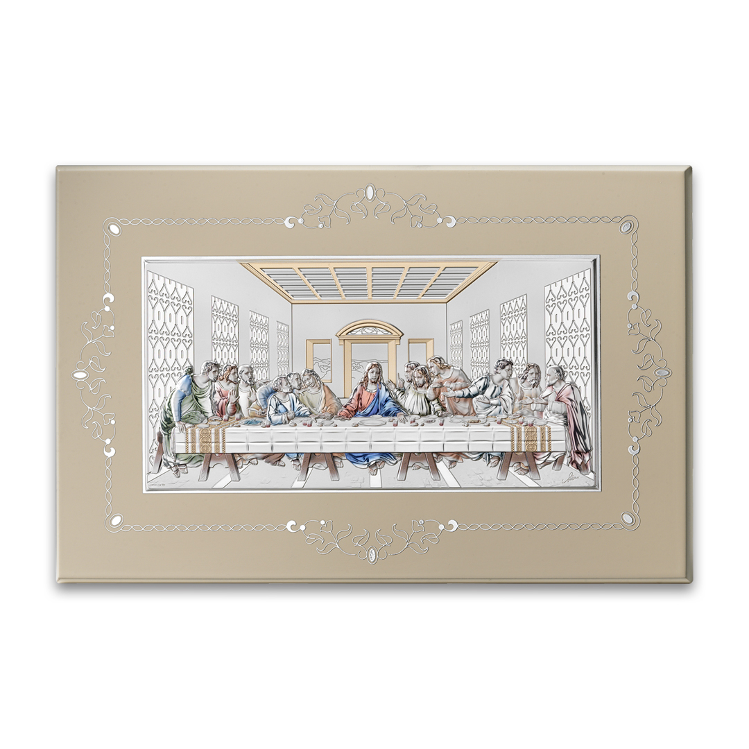 Serie ULTIMA CENA – Pannello in legno laccato sabbia / placca argento con parti colorate