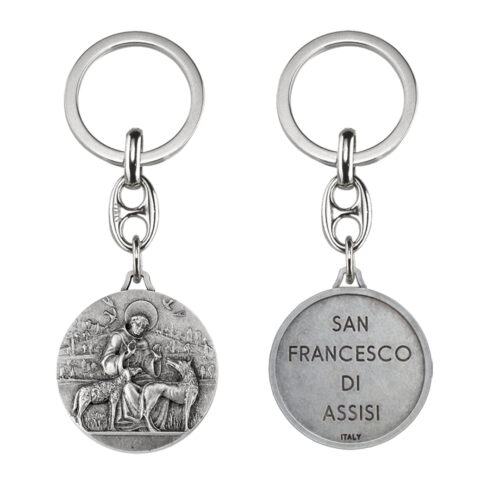 Portachiavi San Francesco con lupo e agnello in metallo argentato