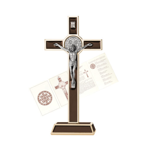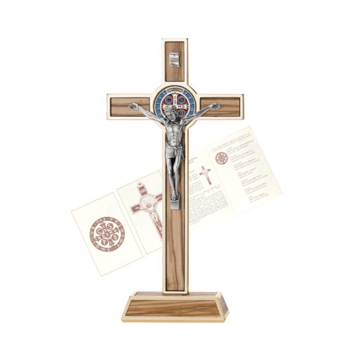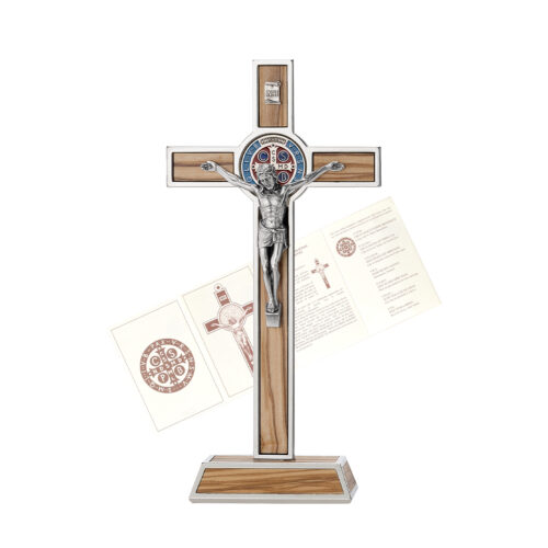 Croce San Benedetto con base, nichelata/inserti in legno ulivo/medaglie smaltate