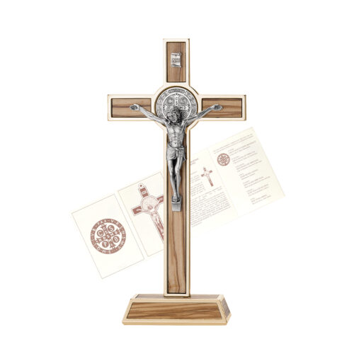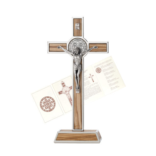 Croce San Benedetto con base, nichelata/inserti in legno ulivo