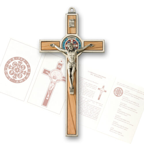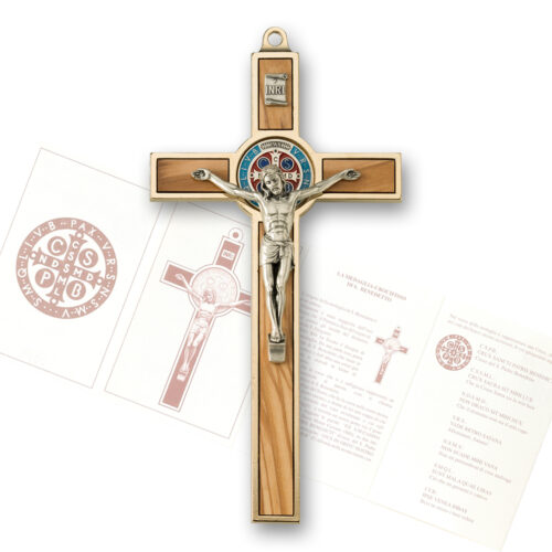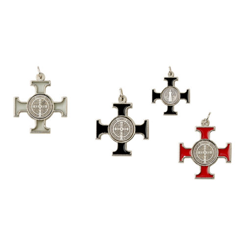 Croce San Benedetto nichelata/inserti in legno ulivo/medaglie smaltatate