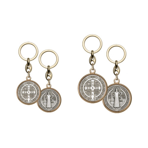 Portachiavi San Benedetto in metallo dorato con medaglie argentate