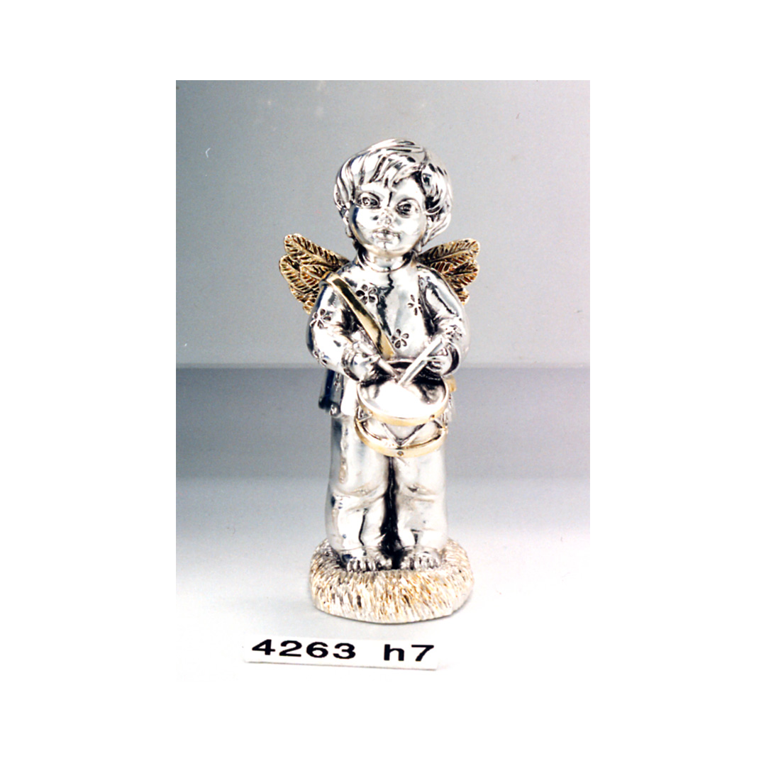 Angelo che suona il tamburo in resina argentata e colorata