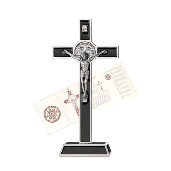 Croce San Benedetto con base, in metallo nichelato e smaltato con Cristo e medaglie argentati
