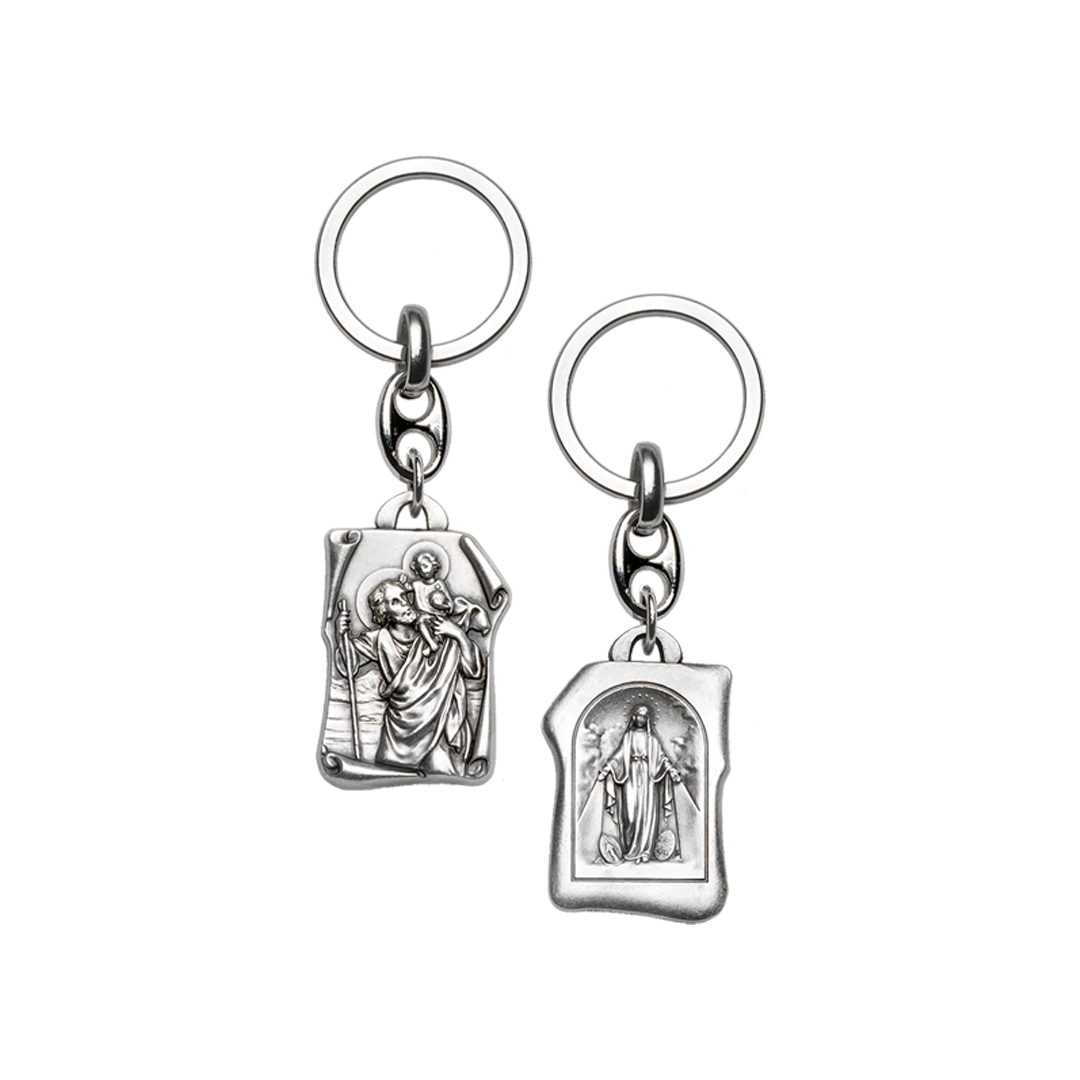 Portachiavi a pergamena in metallo argentato – San Cristoforo e Madonna Miracolosa