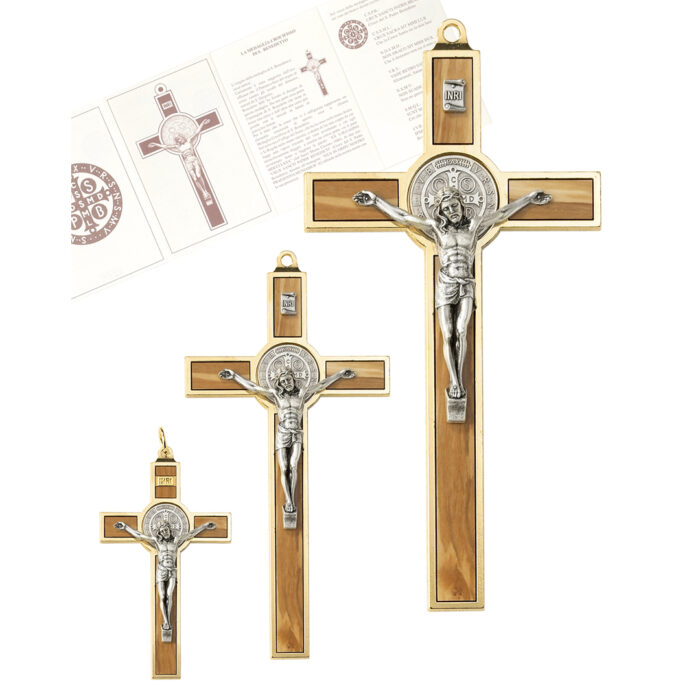Croce San Benedetto dorata con inserti in legno ulivo e Cristo e medaglie argentati