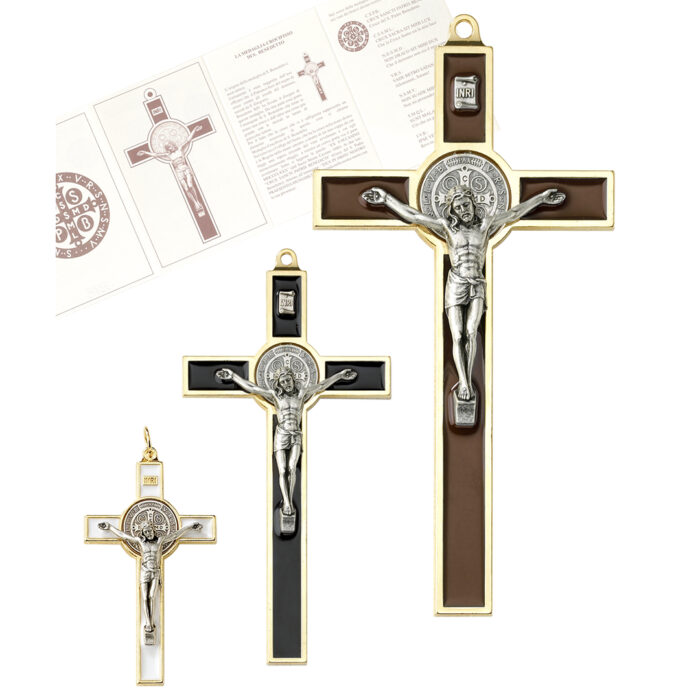 Croce San Benedetto dorata e smaltata con Cristo e medaglie argentati