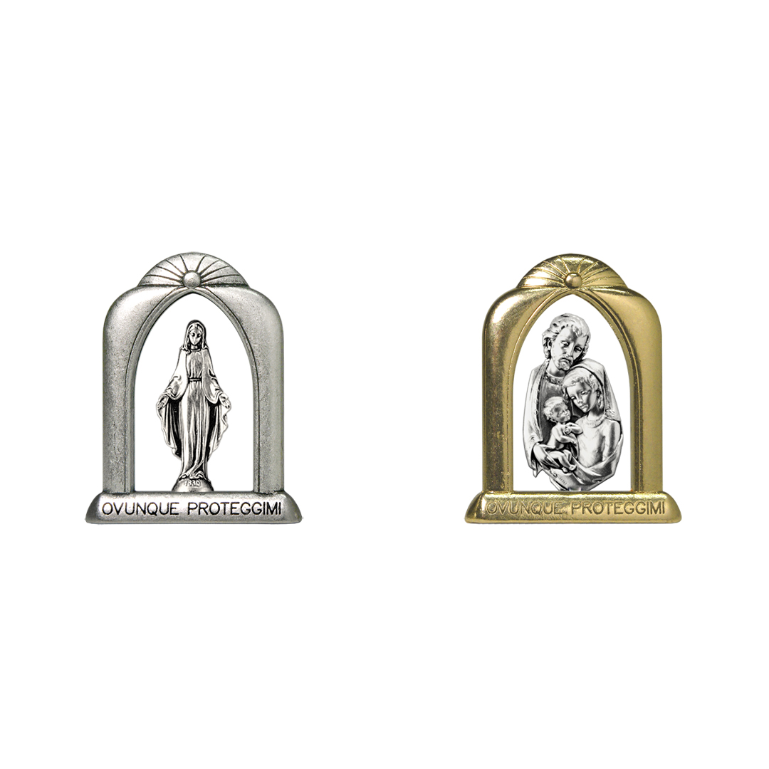 Cornicetta in metallo argentato o dorato con scritta “ovunque proteggimi” con statua in metallo argentato – Serie micro statue h 2,5 cm