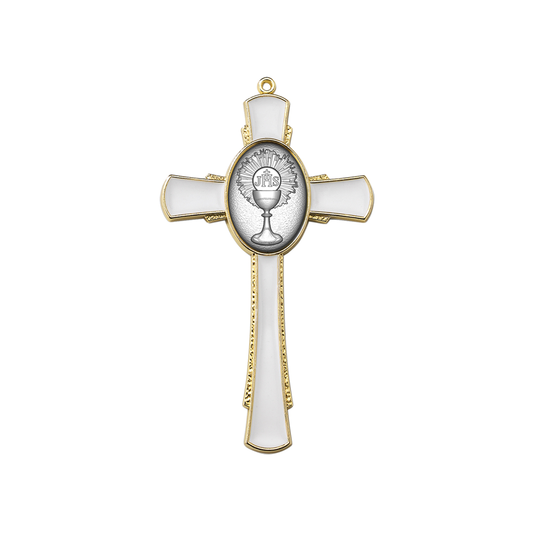 Croce in metallo dorata / smaltata con placca in metallo argentato – Serie placche ovali 2×3 cm Zama