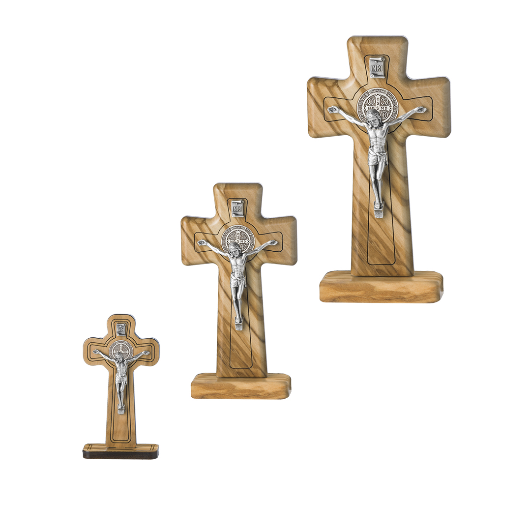 Croce San Benedetto con base, in legno ulivo con Cristo e medaglie argentati